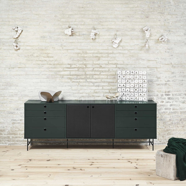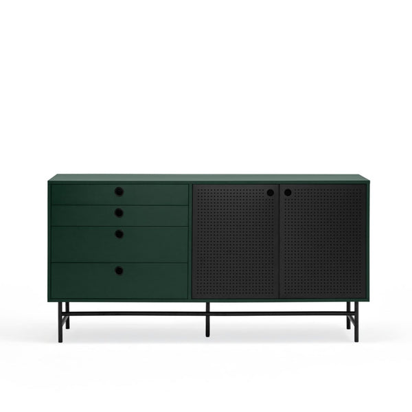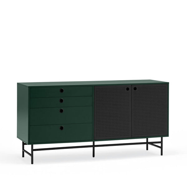 Punto Sideboard, Four Drawers, Two Industrial Design Metal Doors, Wood with Metal Frame, Four Shelves - Dark Green and Matt Black Finish