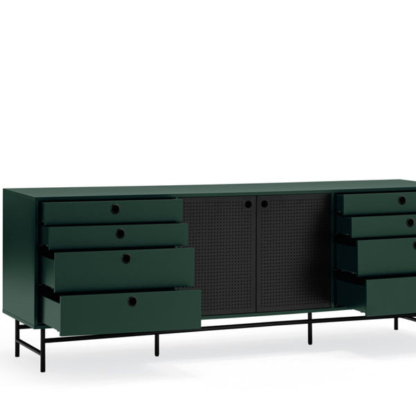 Punto Sideboard, Eight Drawers, Two Industrial Design Metal Doors, Wood with Metal Frame, Four Shelves - Dark Green and Matt Black Finish