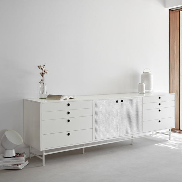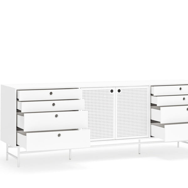 Punto Sideboard, Eight Drawers, Two Industrial Design Metal Doors, Wood with Metal Frame, Four Shelves - Matt White Finish