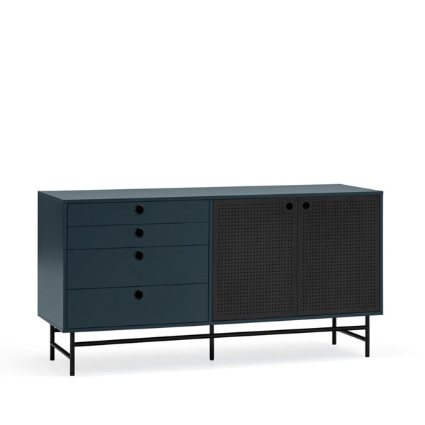 Punto Sideboard, Four Drawers, Two Industrial Design Metal Doors, Wood with Metal Frame, Four Shelves - Dark Blue and Matt Black Finish