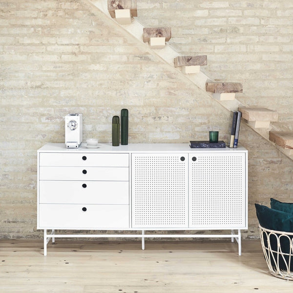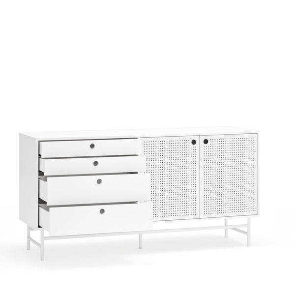 Punto Sideboard, Four Drawers, Two Industrial Design Metal Doors, Wood with Metal Frame, Four Shelves - Matt White Finish