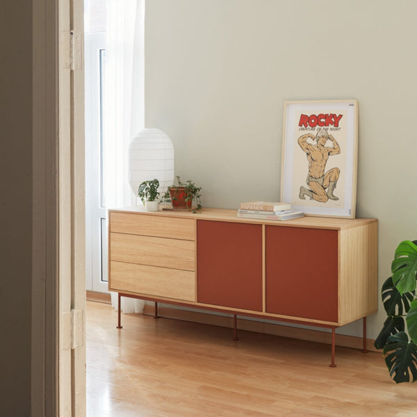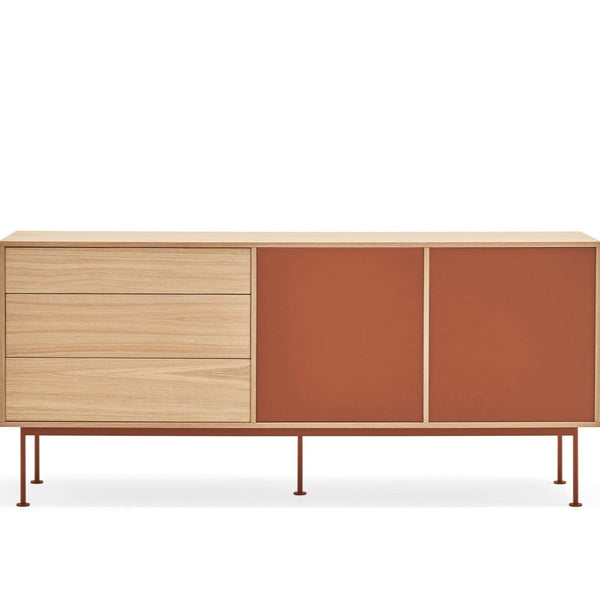 Yoko Sideboard, One Door, Three Drawers, Two Shelves, Modern Wood Design With Metal Frame - Red Brick and Oak Finish