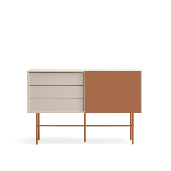 Nube Sideboard, Three Drawers, One Sliding Door, Shelf, Wood with Metal Frame - Sand and Red Brick Finish