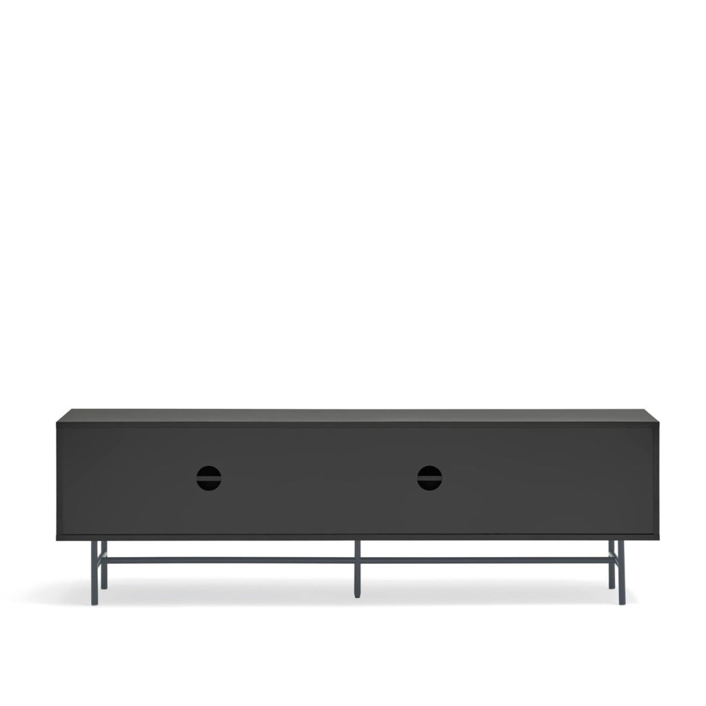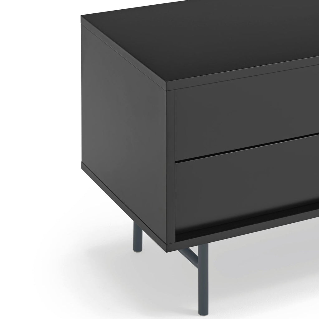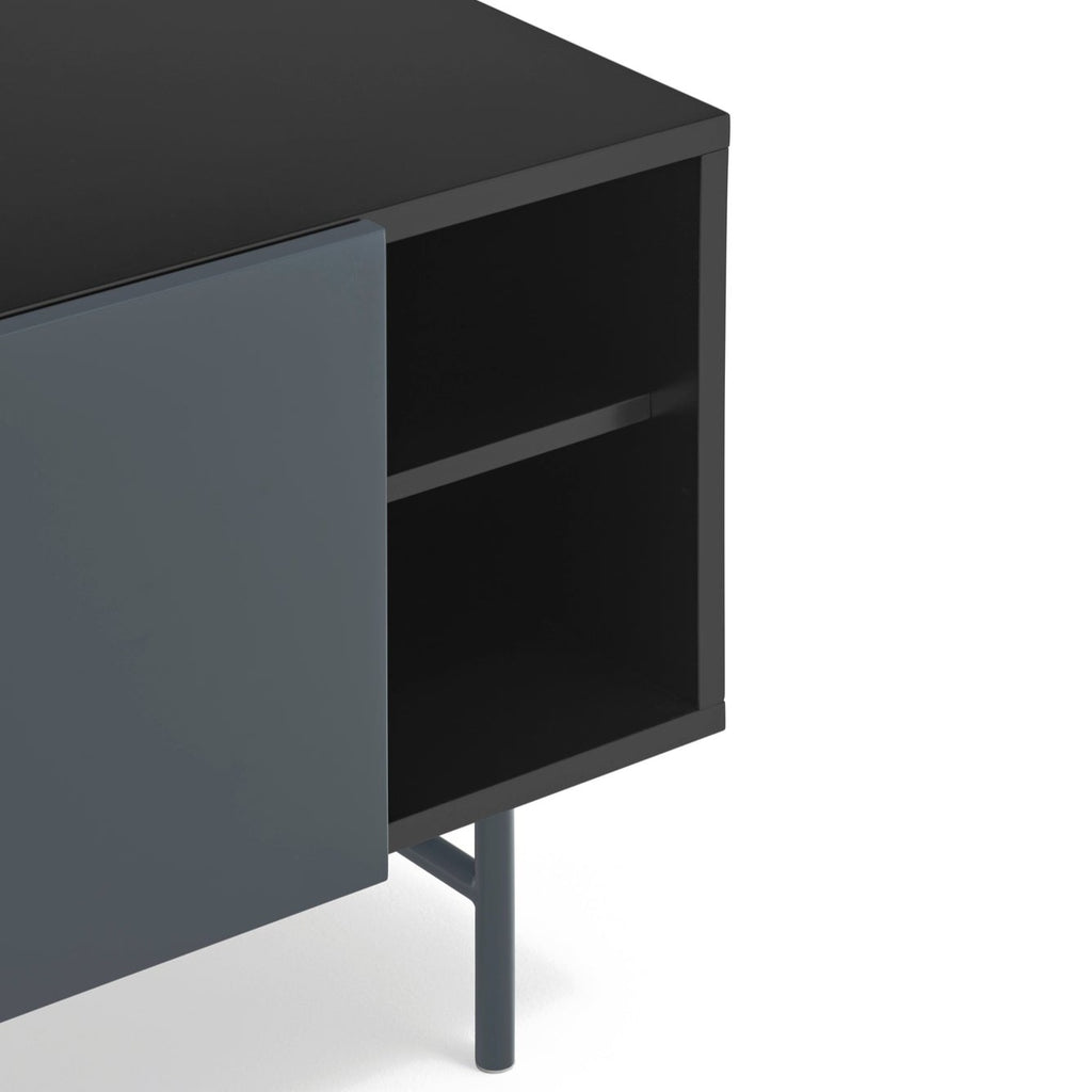 This stunning media unit features a sophisticated black lacquered MDF structure that houses two premium drawers with whisper-quiet soft-close runners. The innovative layout includes a dedicated door compartment with an integrated shelf and strategically placed AV access point for seamless connectivity. The standout anthracite sliding door adds a touch of elegance while offering versatile concealment options—effortlessly glide it to cover either the drawers/door or the open compartment space according to your preference. Supported by a striking black powder-coated metal frame that provides both stability and visual contrast, this cabinet makes a bold statement in any interior. With generous dimensions of 180cm width, 40cm depth, and 56cm height, it offers abundant storage without overwhelming your space.