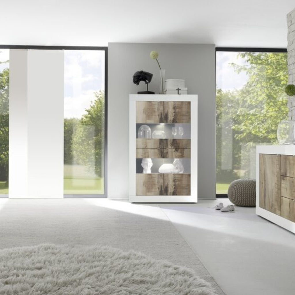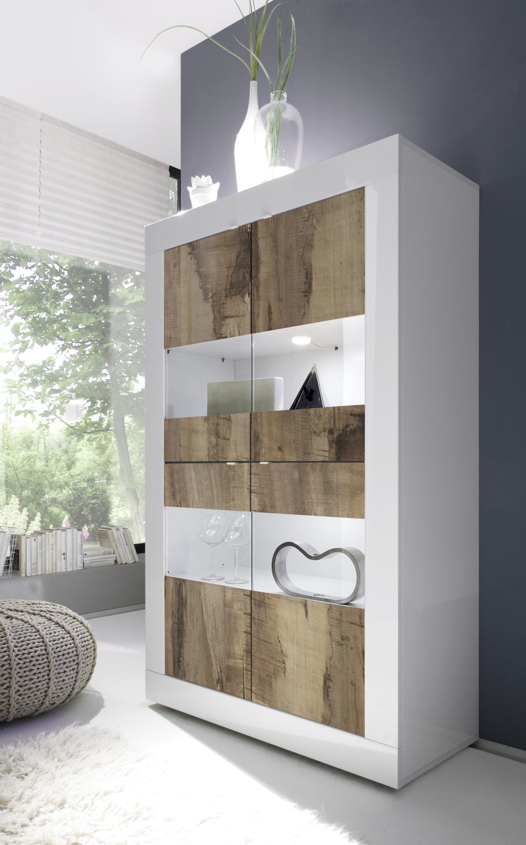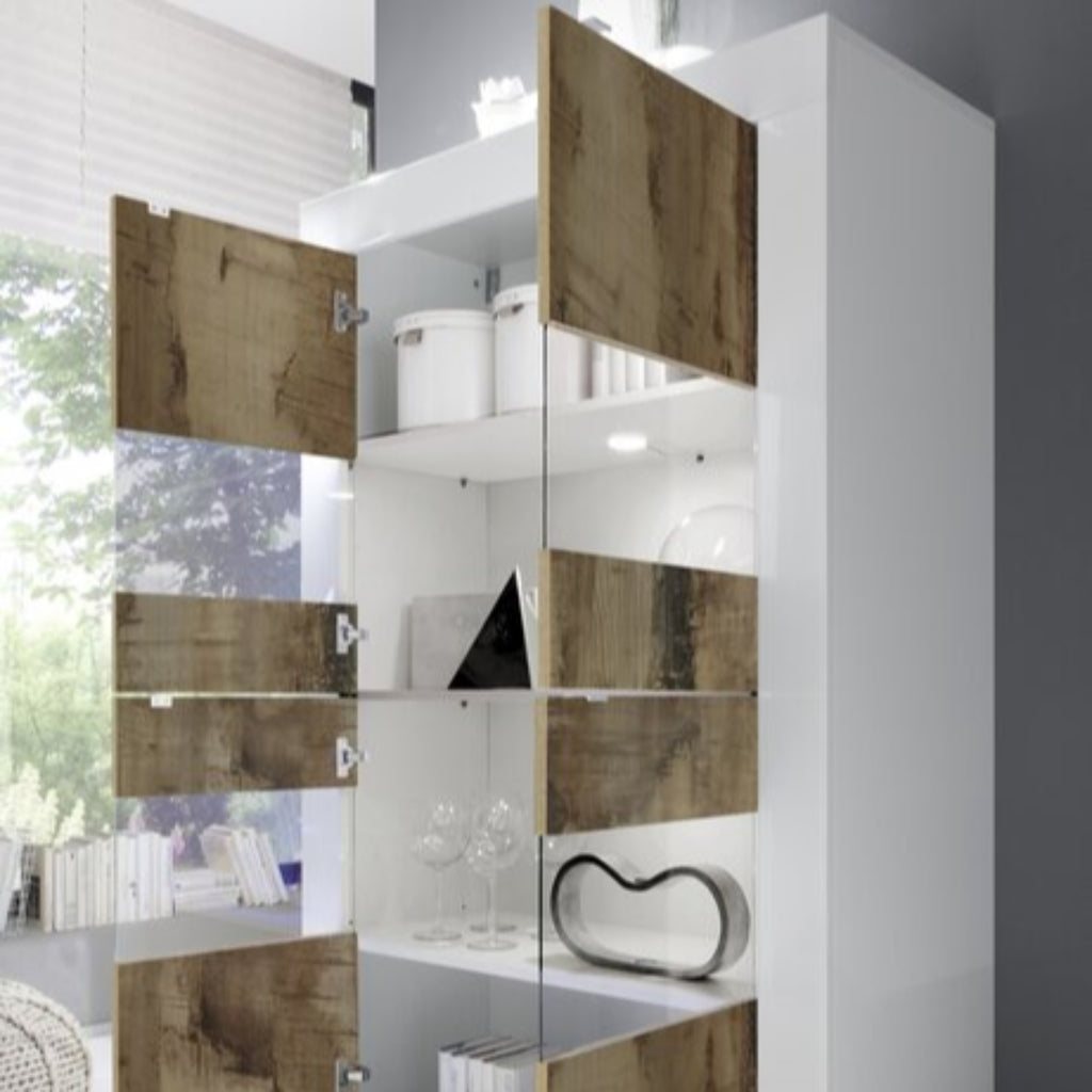 The Bologna Display Cabinet combines sleek gloss white lacquer with elegant natural doors, featuring four glass panels that showcase your treasures beautifully.