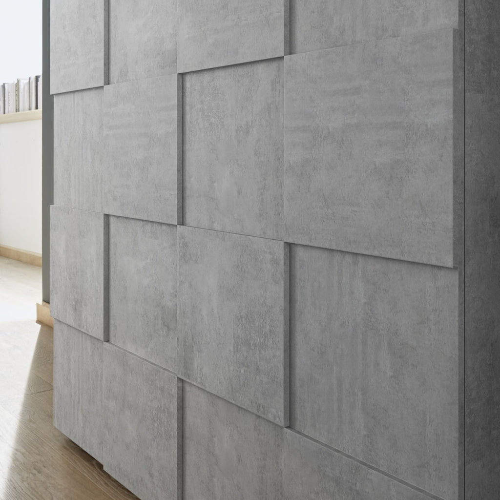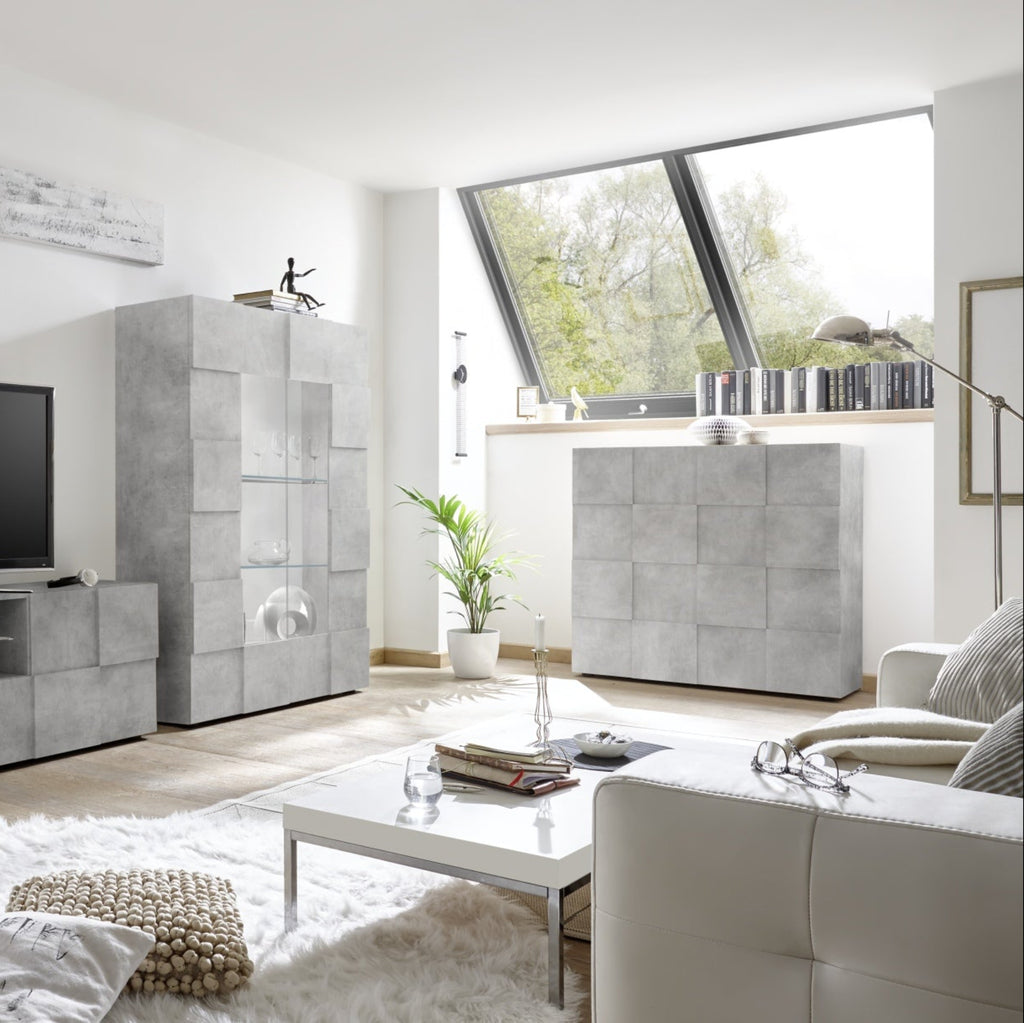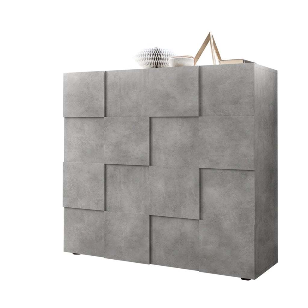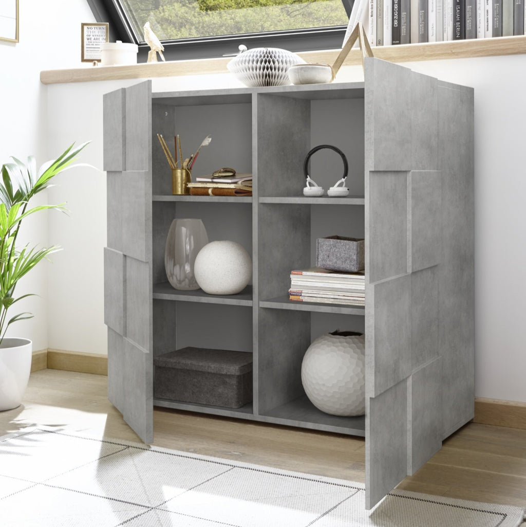 The Donato High Sideboard from the Treviso Collection offers a stunning grey finish with distinctive chequerboard-pattern doors.