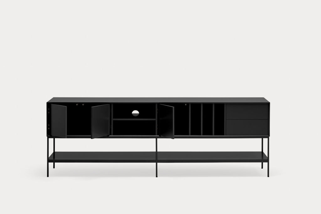 This sophisticated black-finished unit combines three doors, two drawers, and a single shelf for optimal organization, while the dedicated AV access point ensures seamless connectivity. Crafted from lacquered MDF with sleek metal legs and frame, this 220cm wide statement piece offers both style and functionality. Transform your living area with this self-assembly storage solution, professionally delivered to your doorstep by a UK furniture carrier.