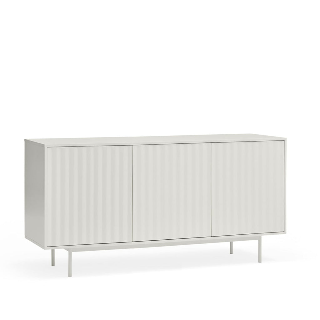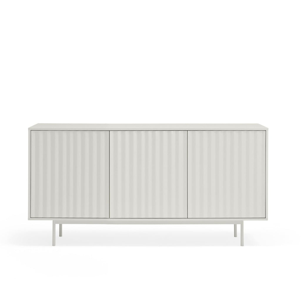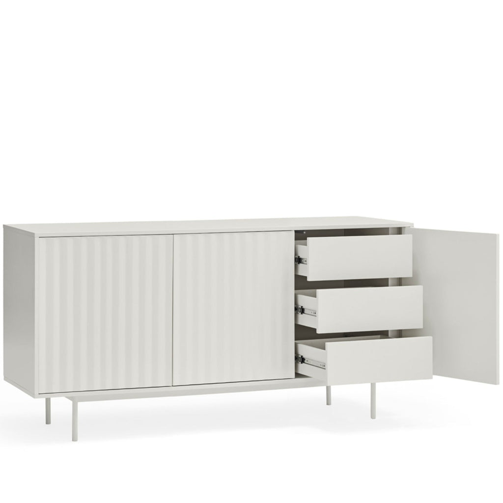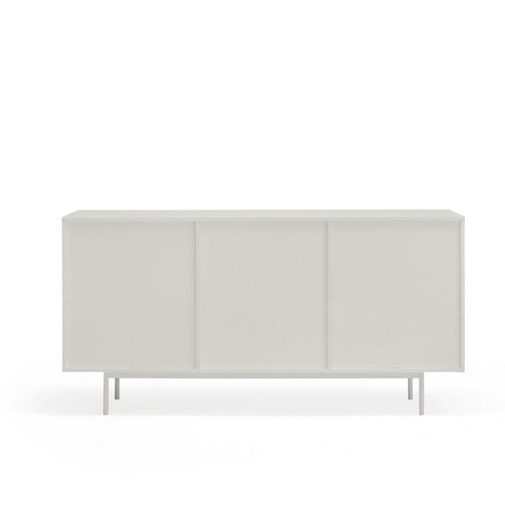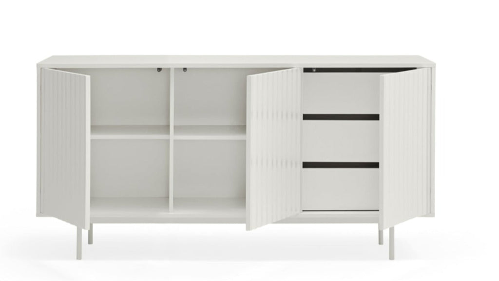 This statement piece offers intelligent storage with three push-release doors revealing four shelves and three soft-close drawers, perfect for organizing your treasured possessions with style. The pristine matt white finish and coordinating powder-coated metal legs exude contemporary elegance while complementing any modern interior. Meticulously designed by Teulat in Spain, this sophisticated 159.2cm wide sideboard combines premium lacquered MDF construction with exceptional craftsmanship. Delivered by professional furniture carriers and ready for simple self-assembly to transform your living space.