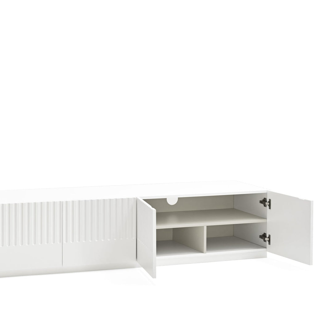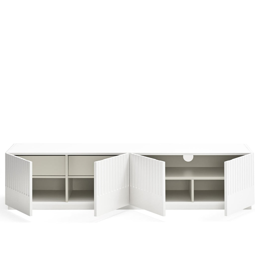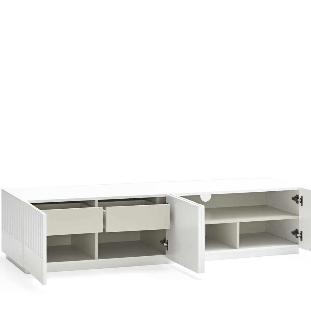 This striking piece features a contoured matt white finish that creates an illusion of depth and texture. Four push-release doors reveal practical storage, including two soft-close drawers and six shelves, while the dedicated AV access point ensures seamless cable management. The contrasting anthracite interior adds a touch of refinement to this Spanish-designed statement piece. Perfect for modern living spaces where style meets functionality.