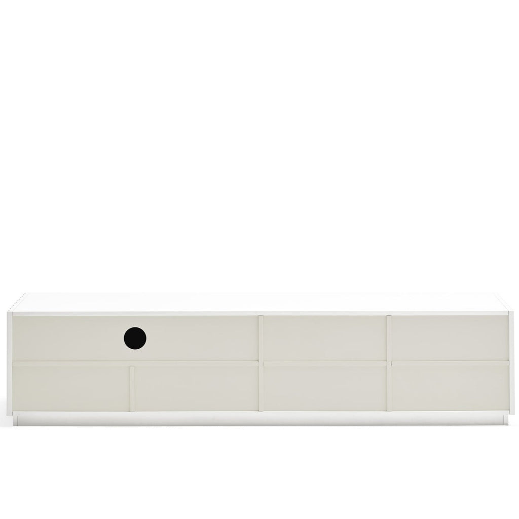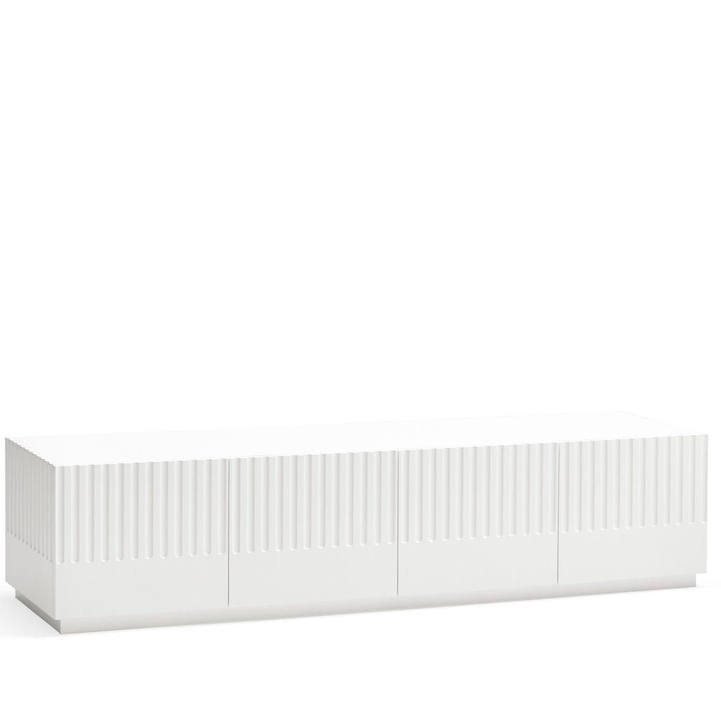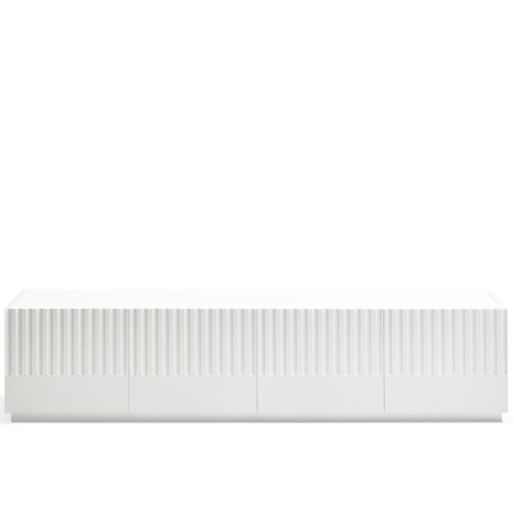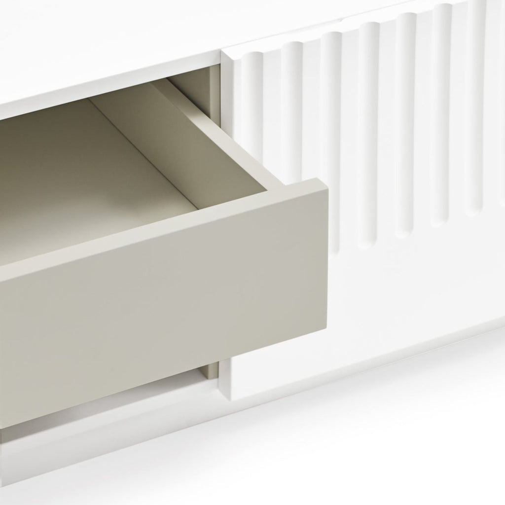 This striking piece features a contoured matt white finish that creates an illusion of depth and texture. Four push-release doors reveal practical storage, including two soft-close drawers and six shelves, while the dedicated AV access point ensures seamless cable management. The contrasting anthracite interior adds a touch of refinement to this Spanish-designed statement piece. Perfect for modern living spaces where style meets functionality.