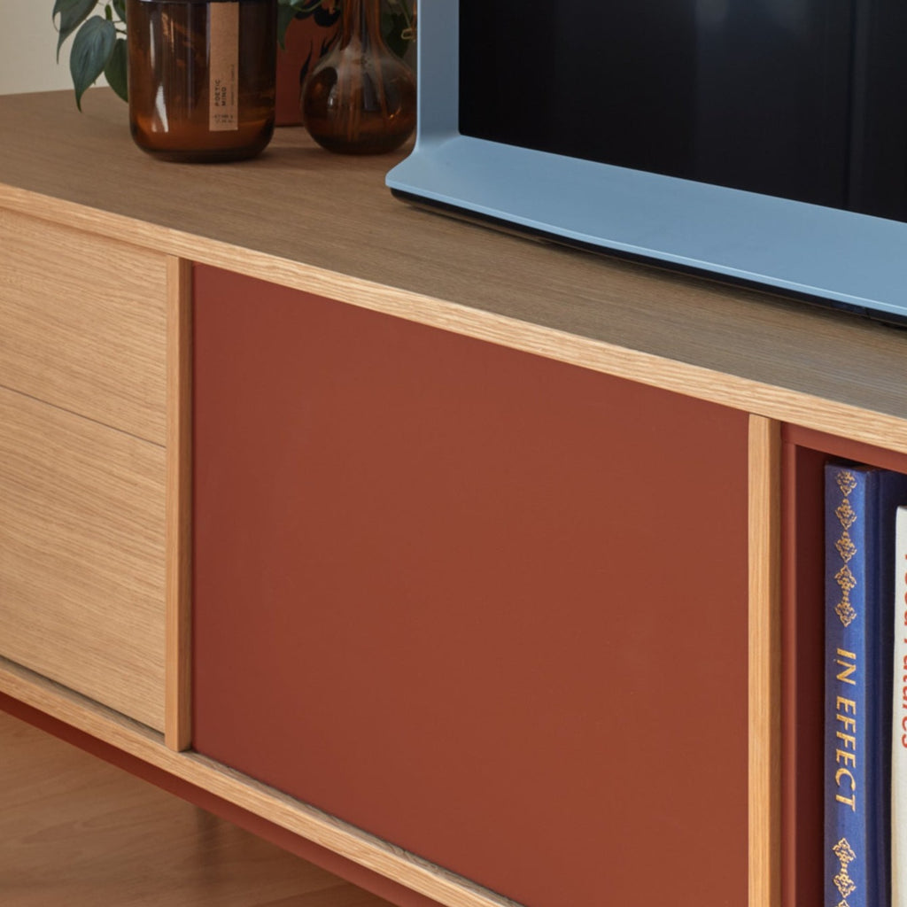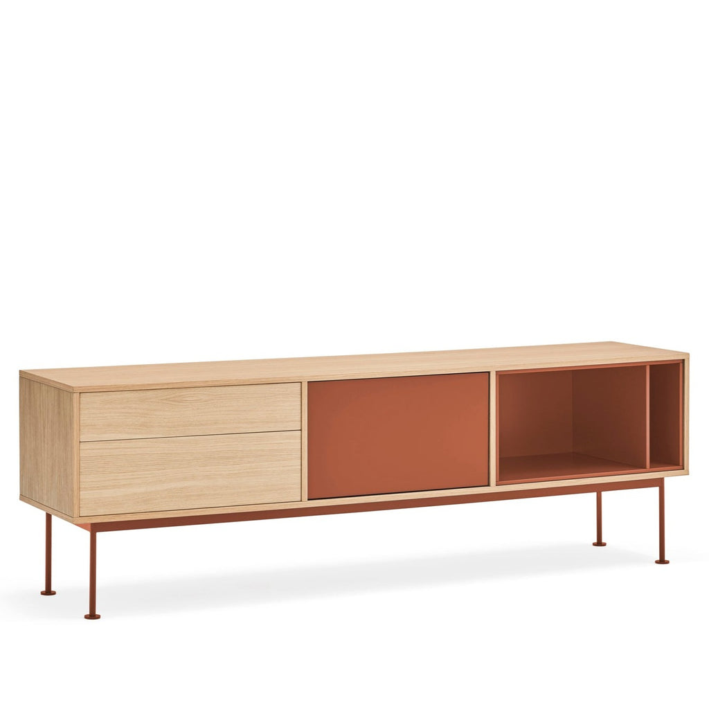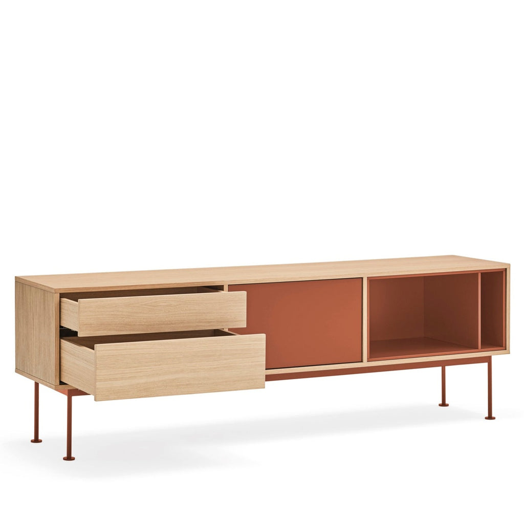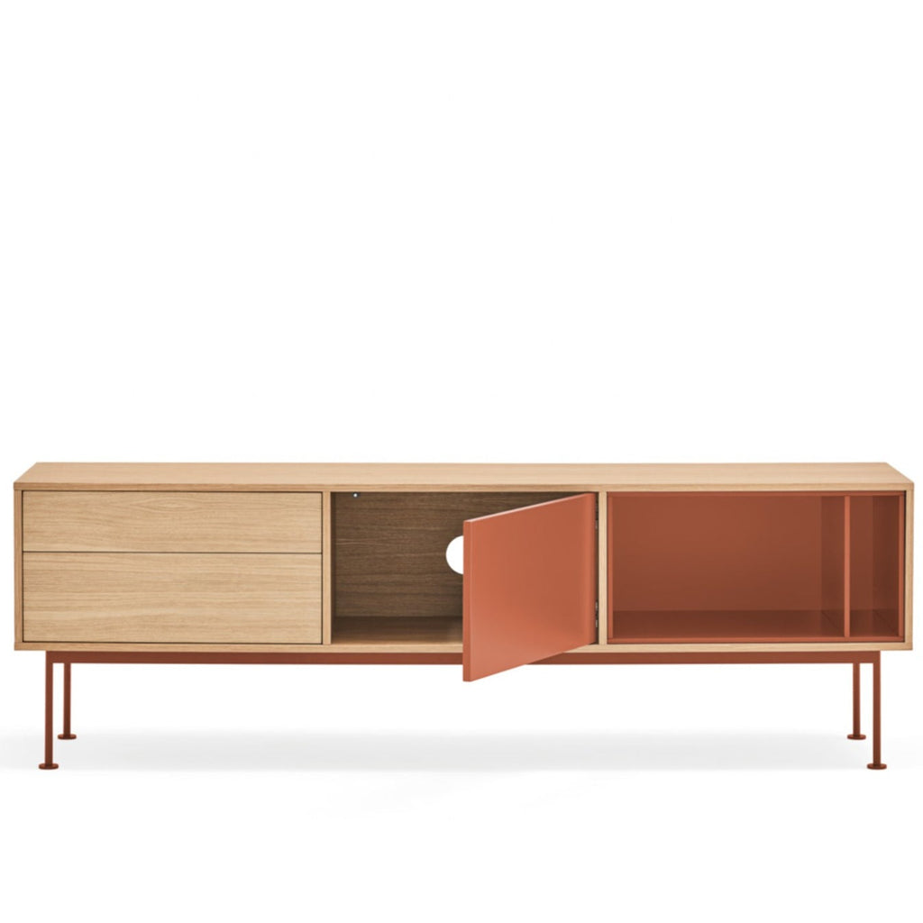 This stunning oak and brick red unit features two smooth-gliding drawers with premium soft-close mechanisms, a dedicated AV compartment with smart cable management, and an additional display area. The powder-coated metal frame in contrasting red with elegant disc feet provides both stability and style. Part of the versatile Yoko collection, this TV stand delivers a modern storage solution that perfectly complements today's interior aesthetics while meeting all your entertainment needs.