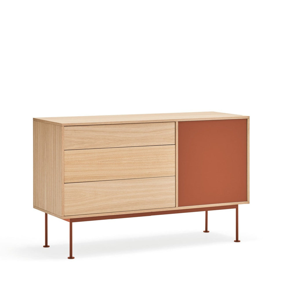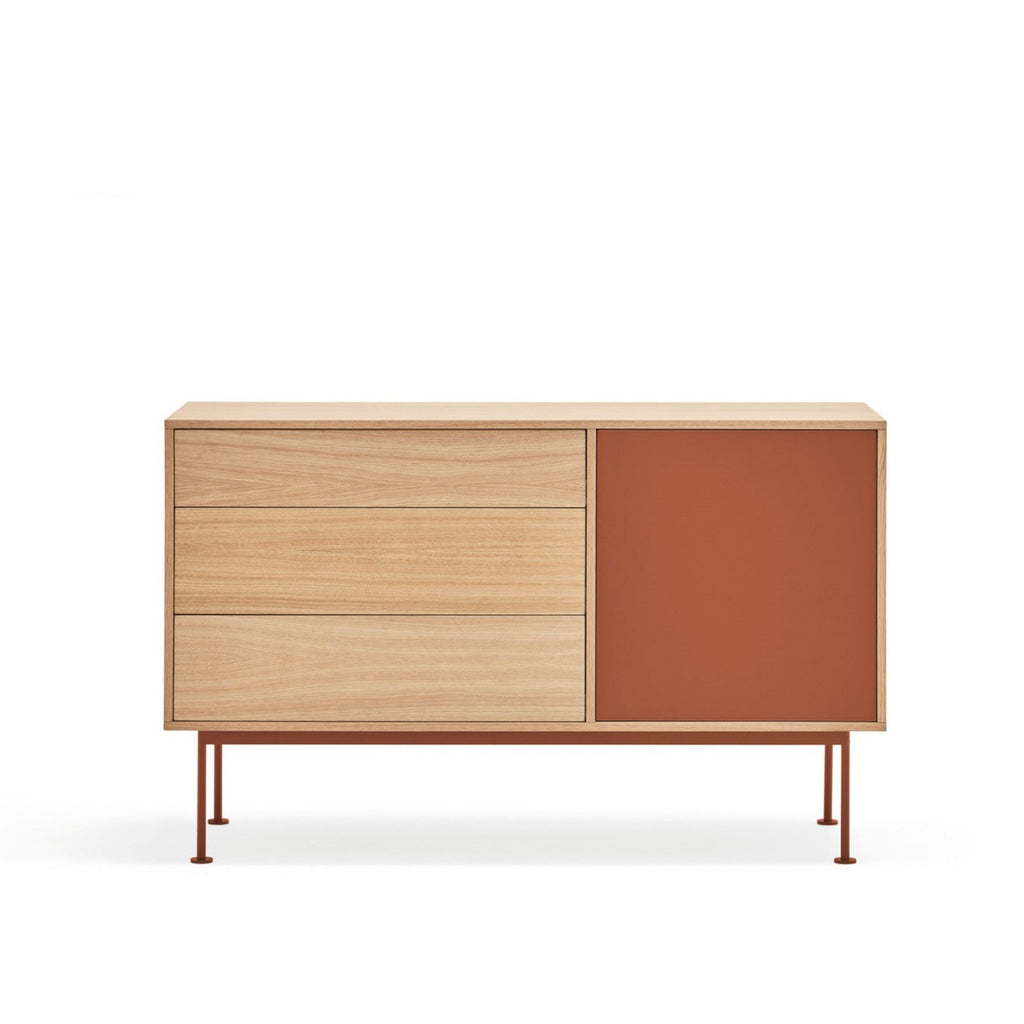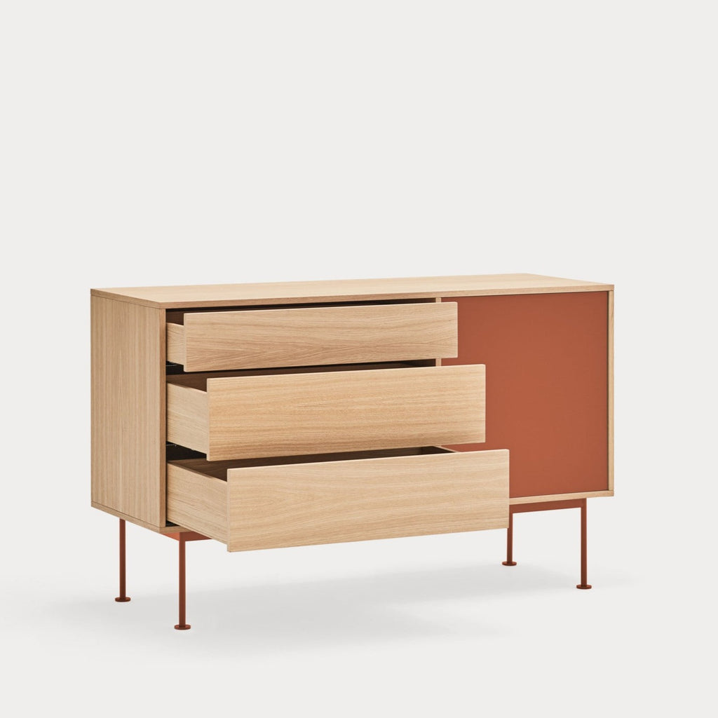 Redefine your living space with the Yoko Sideboard, where timeless oak meets contemporary brick red accents.
