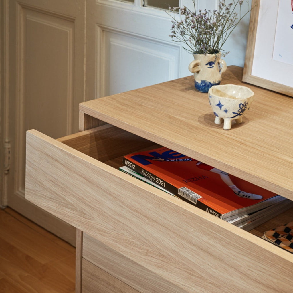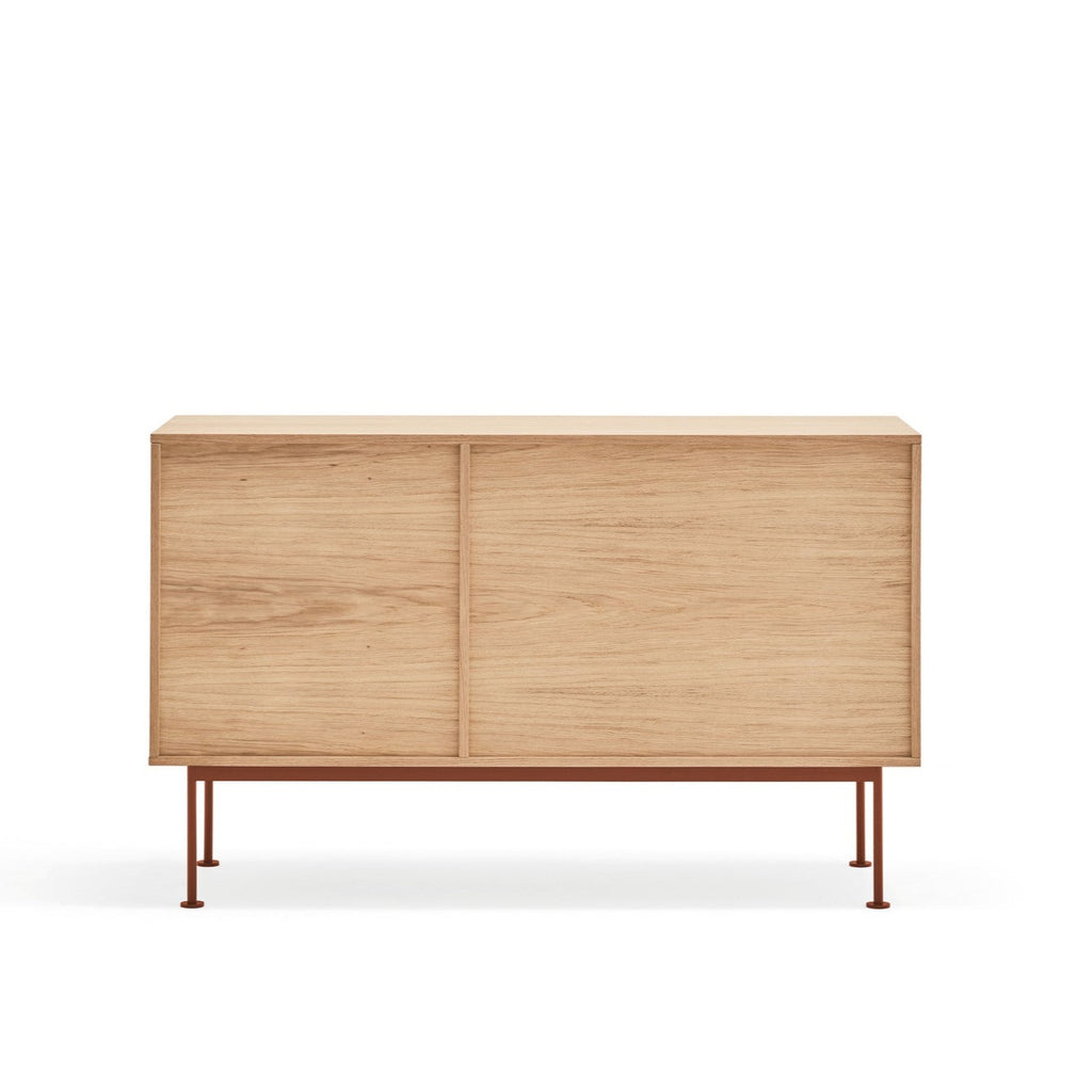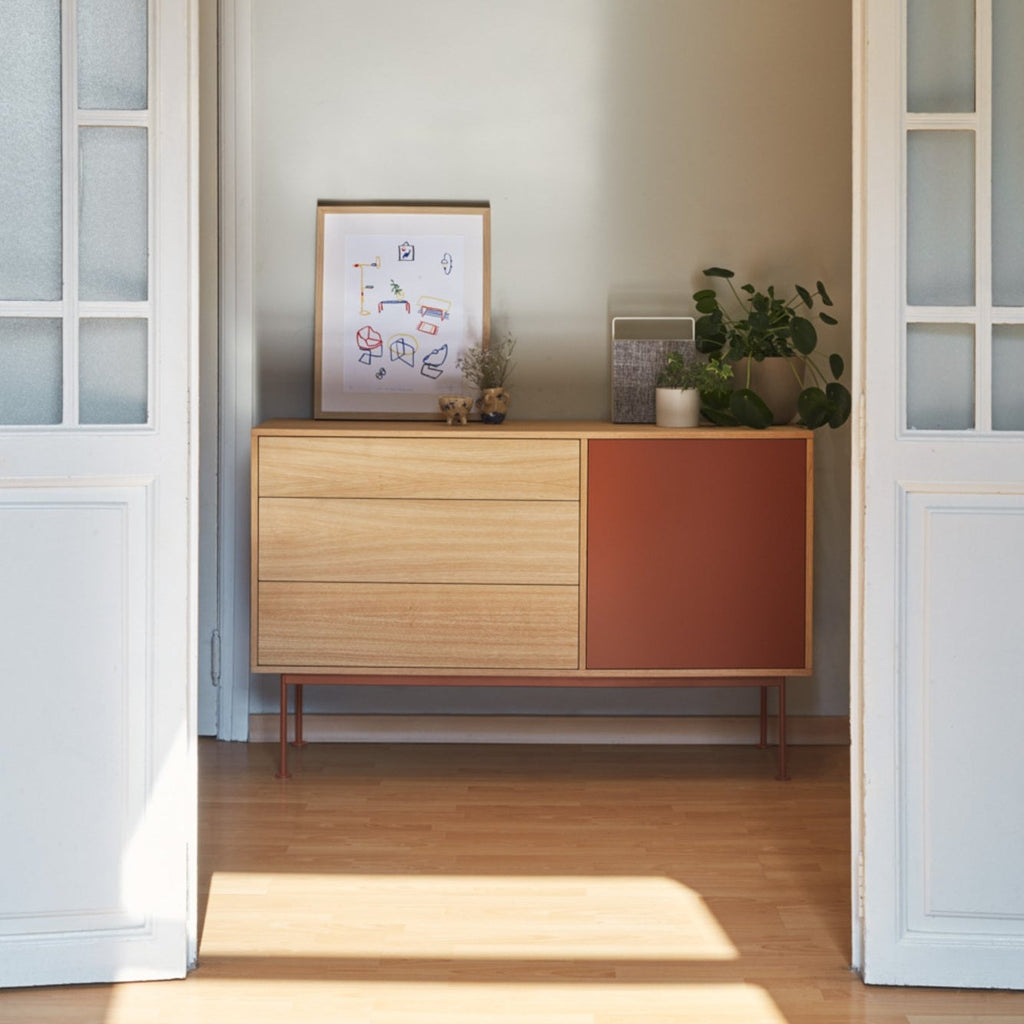 Redefine your living space with the Yoko Sideboard, where timeless oak meets contemporary brick red accents.