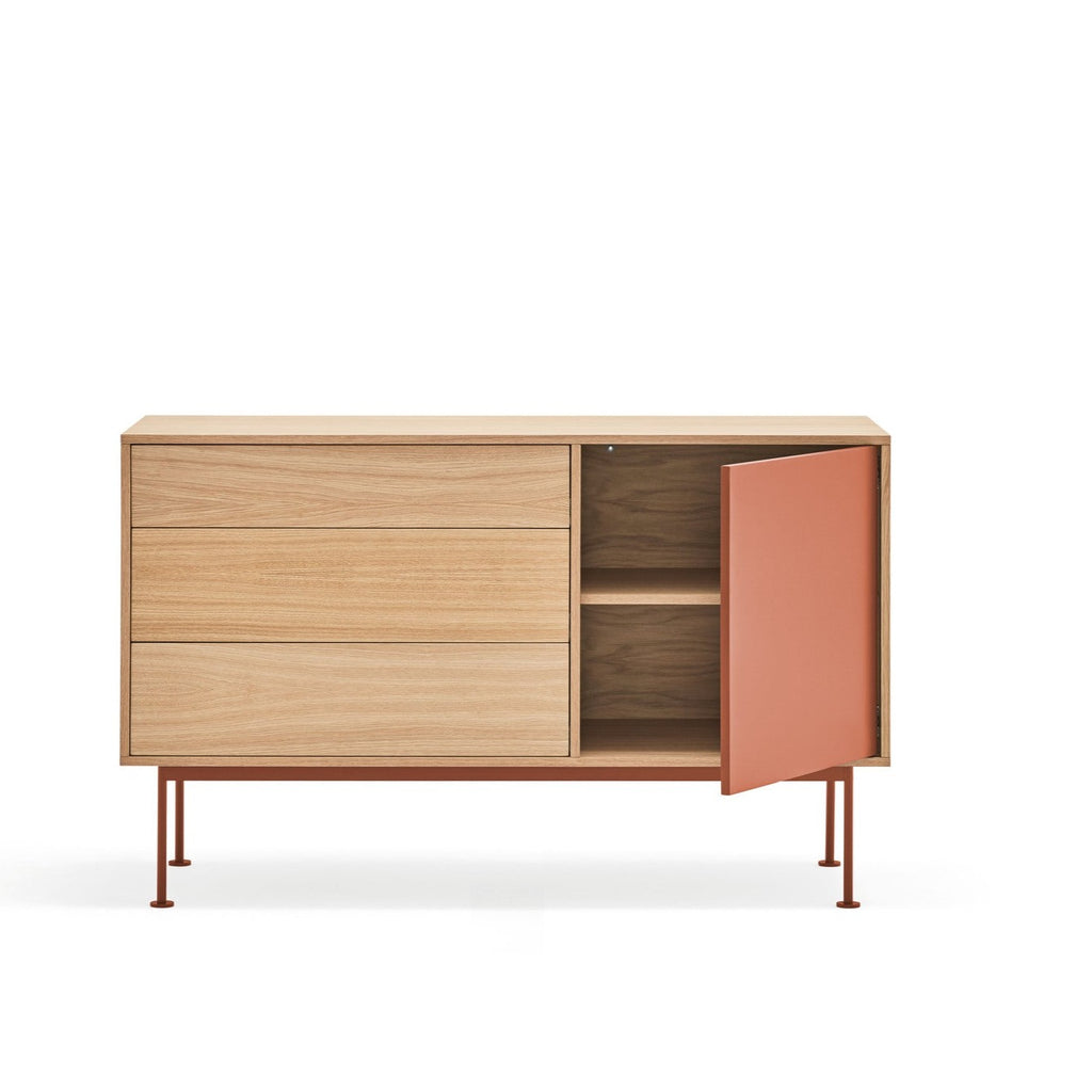 This sophisticated storage solution features three premium soft-close drawers on metal runners and a spacious shelved compartment behind a statement red door. The distinctive powder-coated metal frame with eye-catching disc feet provides both stability and style. At a perfectly proportioned 128cm wide, this versatile sideboard doesn't just organize your belongings—it transforms your interior with its designer aesthetic. Invest in the perfect balance of form and function that will elevate your home for years to come.